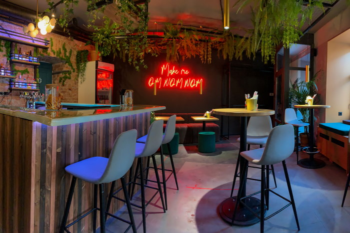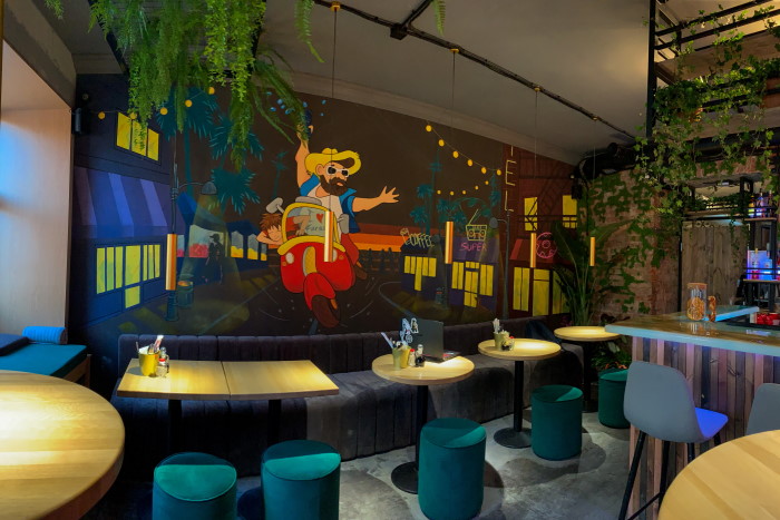 Интерьер заведения оформили в духе курортного азиатского города: в помещении выставили мягкие диваны и зелень от Виктории Мишлановой. Одну из стен украсили неоновой надписью, другую — авторским рисунком от Анны Бронзы.