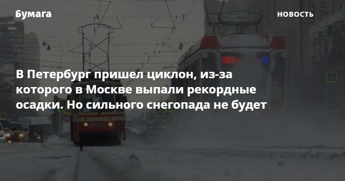 Михаил Леус пояснил «Бумаге», что сильных снегопадов в Петербурге не будет: город находится на периферии циклона, а в Москве метель успокоится уже вечером. Напомним, за два дня в столице выпало три четверти от месячной нормы осадков: к 9:00 13 февраля снежный покров в Москве достиг 56 сантиметров.