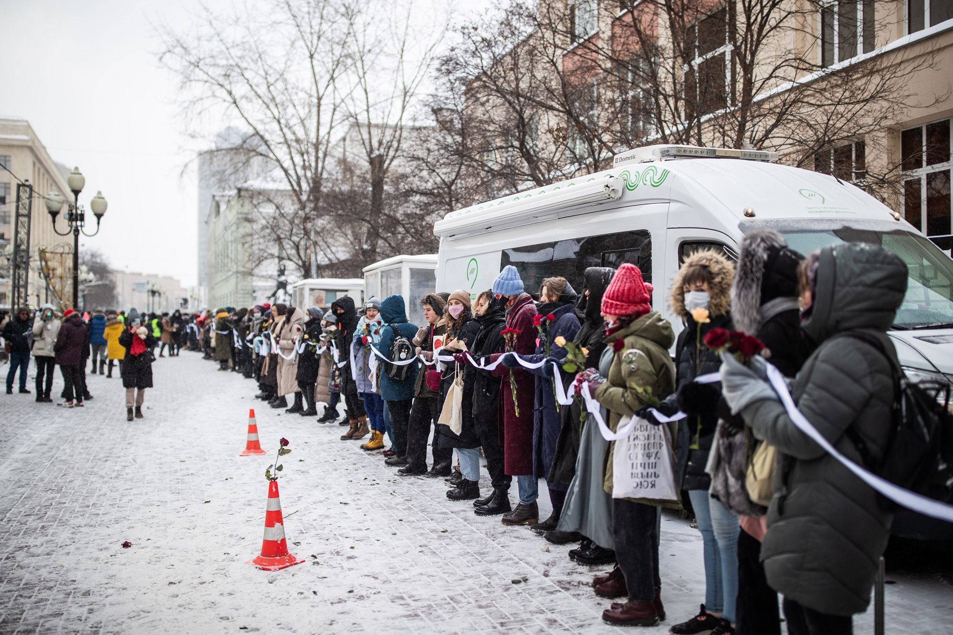 Евгений Фельдман для «Медузы» В центре Москвы 14 февраля прошла акция в поддержку Юлии Навальной и женщин-политзаключенных. На Арбате собрались несколько сотен человек, которые выстроились в «цепь солидарности». Аналогичная акция состоялась в Санкт-Петербурге, там на нее вышли около 70 человек. Подробно о происходящем в России 14 февраля — в онлайне «Медузы».
