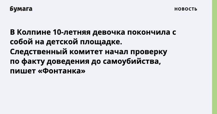 «Фонтанка» со ссылкой на пресс-службу уполномоченной по правам детей Анны Митяниной подтверждает информацию о самоубийстве девочки и добавляет, что СК начал доследственную проверку по факту доведения до самоубийства.