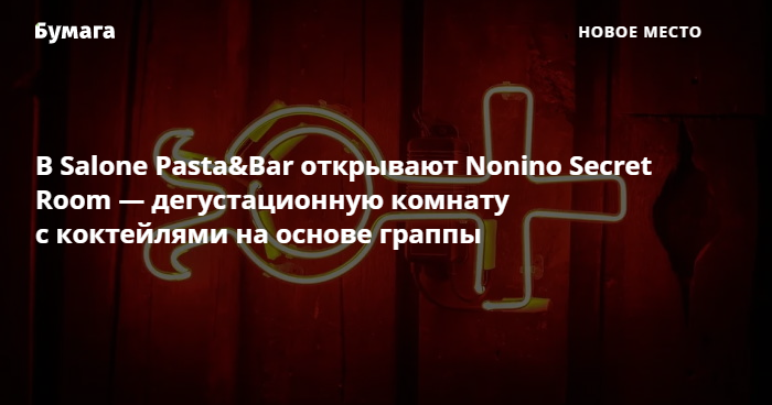 В небольшой комнате на входе в Salone Pasta&Bar (набережная Фонтанки, 30) открывают секретный бар Nonino Secret Room, рассказали «Бумаге» представители заведения. Пространство представляет собой небольшую дегустационную комнату, в которой подают коктейли на основе итальянской граппы и закуски к ним.