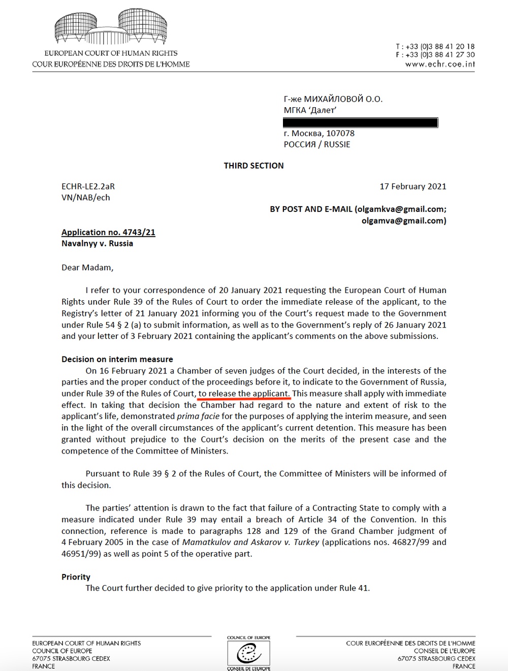 Судьи сослались на 39-е правило регламента ЕСПЧ. В нем говорится, что ЕСПЧ может принять обеспечительные меры, являющиеся обязательными для государства, которого они касаются. Такие меры применяются только в исключительных случаях: например, когда заявитель может подвергнуться реальному риску причинения непоправимого вреда.