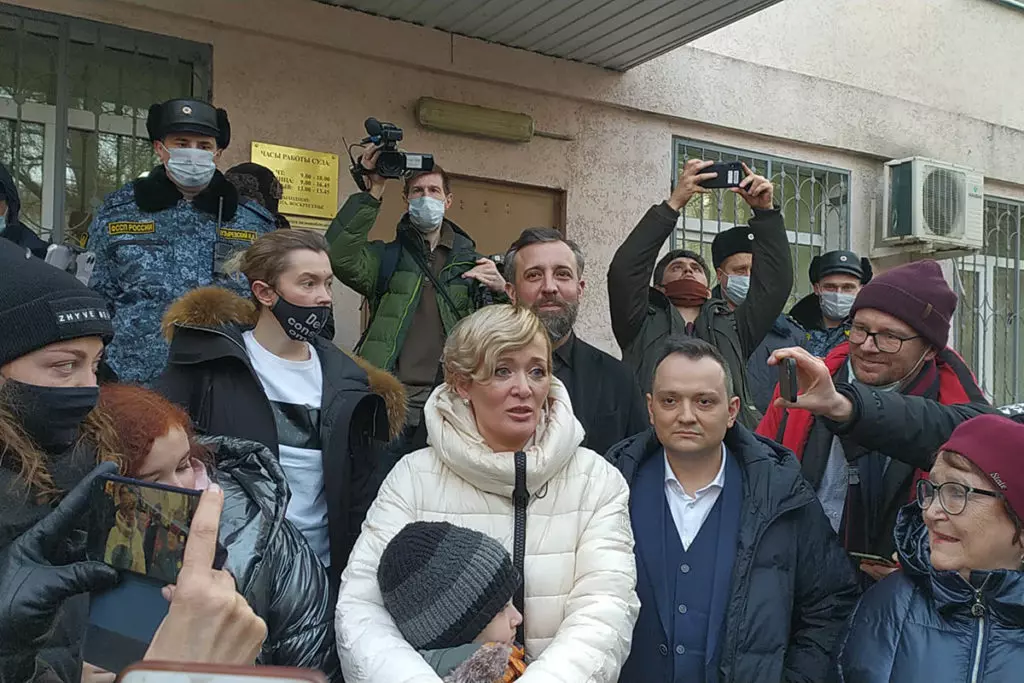 За ней вышла сама Анастасия с детьми и адвокатами Бадамшиным и Ковалевичем. Толпа встретила Настю бурными овациями и аплодисментами.