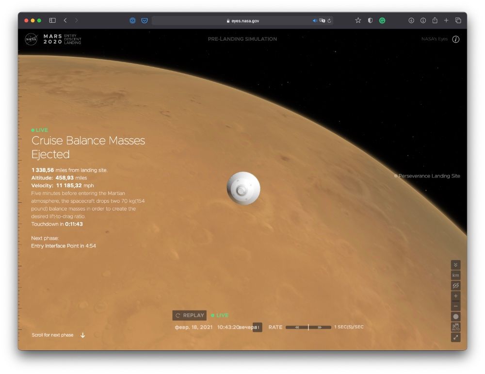 Вот как должен выглядеть «Персеверанс» на подлете к Марсу. Примерно через полчаса он начнет влетать в атмосферу планеты.