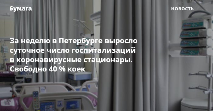 За неделю в Петербурге на 7 % выросло суточное число госпитализаций в коронавирусные стационары, следует из отчета городского координационного совета. При этом число пациентов с COVID-19, обратившихся за медпомощью, уменьшилось на 34 %.