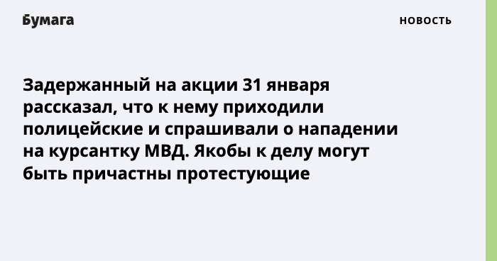 Житель Красносельского района, которого задержали на акции 31 января, анонимно рассказал «Бумаге», что полицейские пришли к нему домой и задавали вопросы о нападении на курсантку МВД. По его словам, правоохранители пояснили, что к делу могут быть причастны участники протестов.
