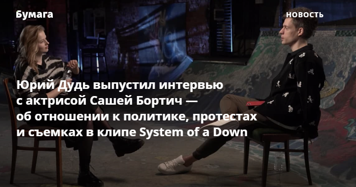 На ютьюб-канале «вДудь» вышло интервью с актрисой Сашей Бортич. Посмотреть его можно по ссылке.