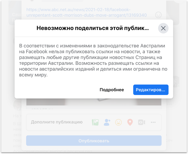 Более того, даже сами пользователи не могли делиться в своих лентах ссылками на публикации новостных сайтов — тут же всплывало окошко, что это теперь невозможно. Причем даже живущие в других странах пользователи перестали видеть в фейсбуке австралийские СМИ или больше не могли делиться ими.