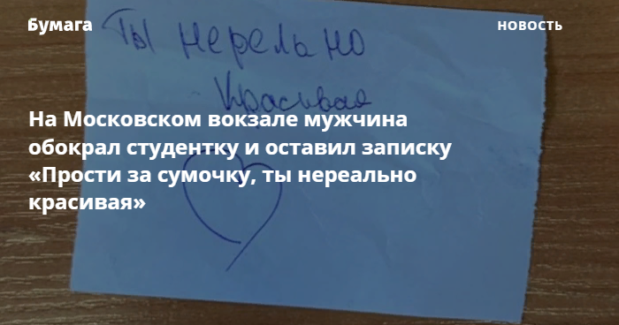 По данным управления, 22-летний безработный мужчина зашел в центральный зал вокзала, чтобы погреться. Он обратил внимание на пару, которая зашла в кафе перед отправлением поезда. Свои вещи они оставили без присмотра на несколько минут — в этот момент злоумышленник украл сумочку. Часть содержимого он забрал, а сумку оставил на ближайшей станции метро. К ней он приложил записку с текстом «Прости за сумочку / Ты нереально красивая» и нарисованным сердечком.