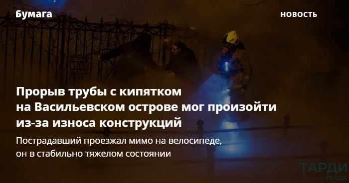 Прорыв трубы с горячей водой на 7-й линии Васильевского острова, в результате которого пострадал мужчина, мог произойти из-за износа системы теплоснабжения. Об этом «Бумаге» сообщили в «Теплосети Санкт-Петербурга».