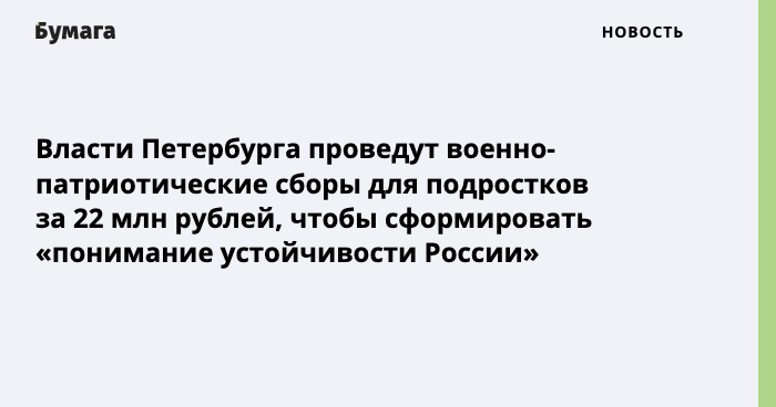 Комитет по молодежной политике открыл конкурс на проведение военно-патриотических сборов для подростков за 22 миллиона рублей, цель которых сформировать основы патриотического сознания и понимание устойчивости России. Соответствующий тендер опубликован на портале государственных закупок.