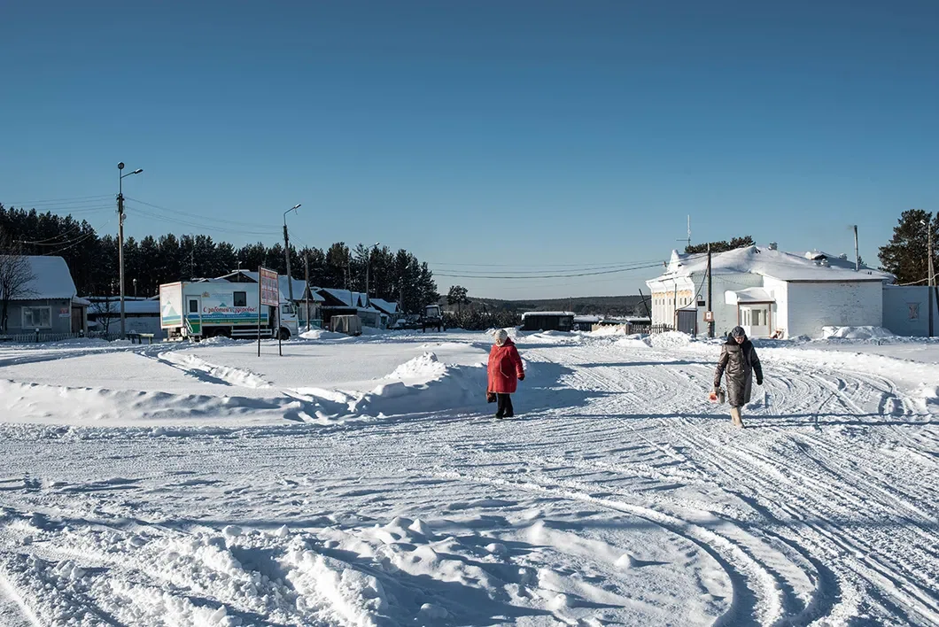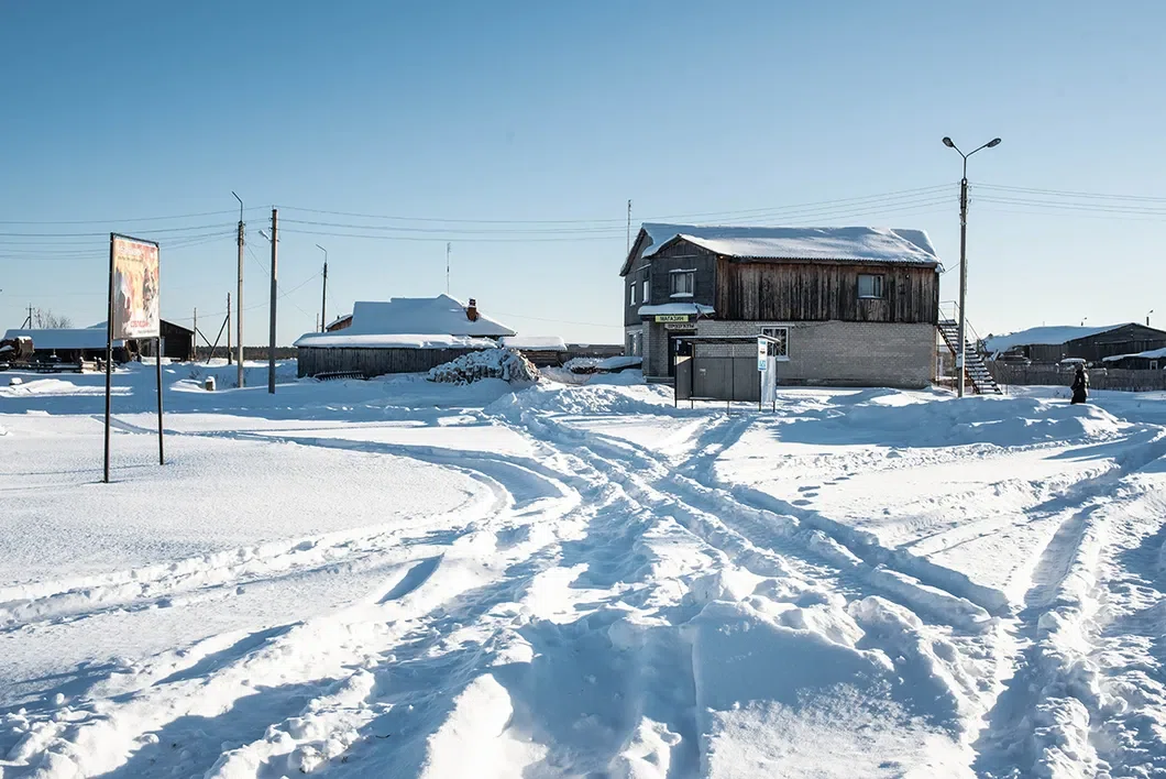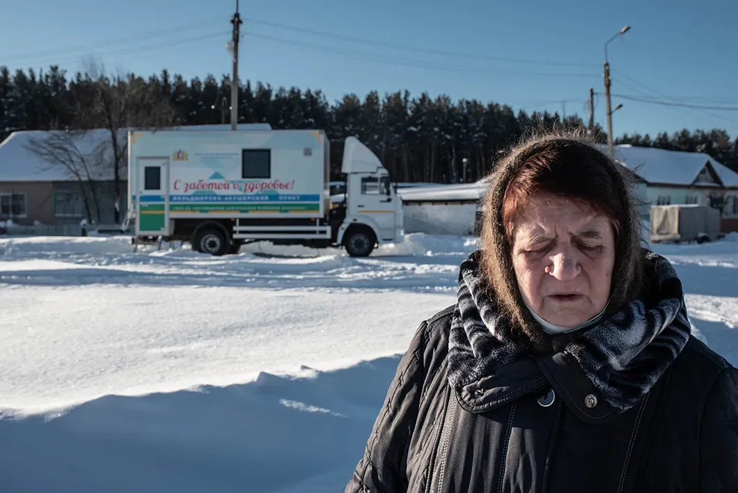 Сугробы снега ярко искрятся от крепкого тридцатиградусного мороза. Насупленный, распушивший весь свой мех кот сидит на деревянном заборе и жмурится от слепящего солнца. Где-то вдалеке видно медленно бредущих по дороге женщин. Они крепко держат друг друга под руки, чтобы не оступиться. В руках у некоторых — палочки для ходьбы. Пенсионерки медленными шажками, скользя по льду, направляются к белому фургону — мобильному фельдшерско-акушерскому пункту, на котором большими буквами написано «С заботой о здоровье». К двери ведет лесенка.