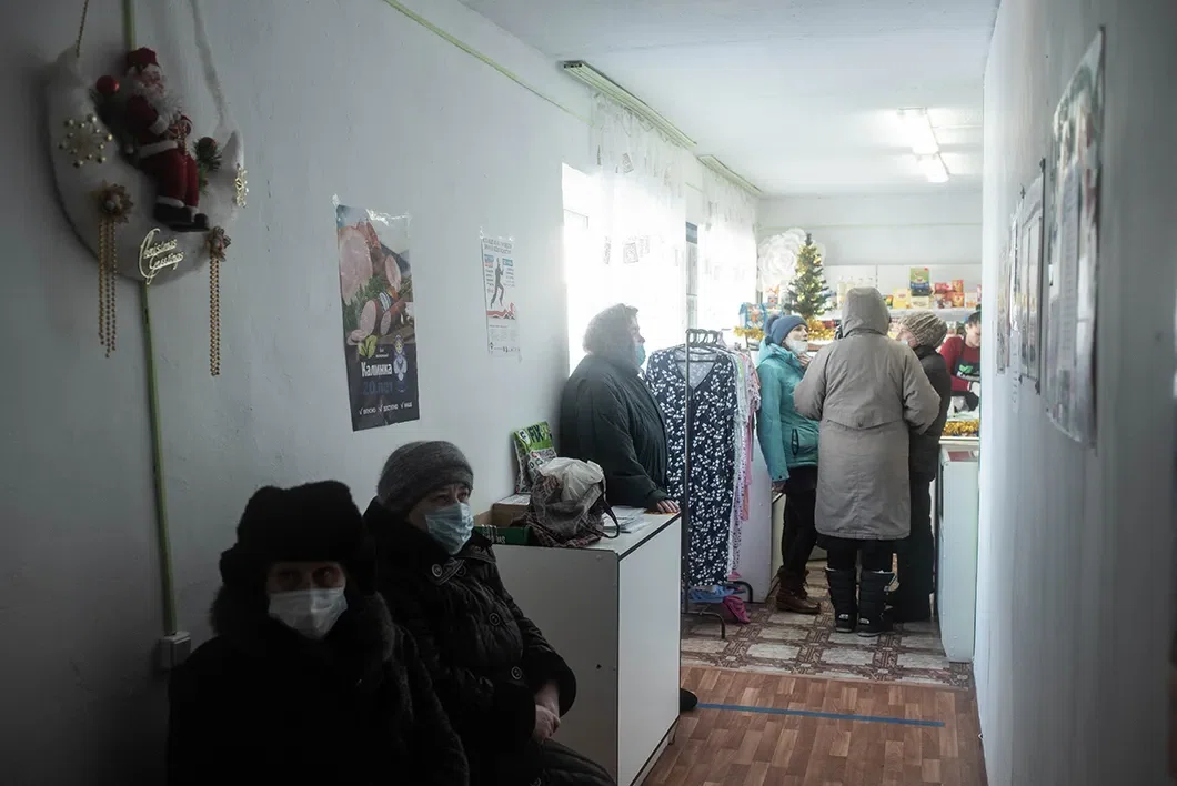Разговаривать на воздухе дольше пяти минут тяжело из-за ветра, поэтому женщины предлагают зайти погреться в магазинчик — место встречи жителей двух сел. У ног все это время суетится местный любимец — непоседливый, но очень ласковый черный пес по кличке Гром. На витринах первым рядом — термоколготки, утепленные носки и варежки. Пенсионерки рассаживаются на скамейках внутри помещения — здесь уже не меньше 20 человек, кто хочет высказаться. Внутрь проскальзывает и водитель ФАПа, который записывает все происходящее на диктофон.