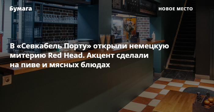 В пространстве «Севкабель Порт» начал работу еще один гастрономический резидент — немецкая митерия Red Head, сообщили «Бумаге» представители проекта. Владельцы заведения — Алена Булатова и Виталий Корнеев (другой его проект — бургерная Street Suvid, работающая сейчас в пространстве Street Food Bar № 1).