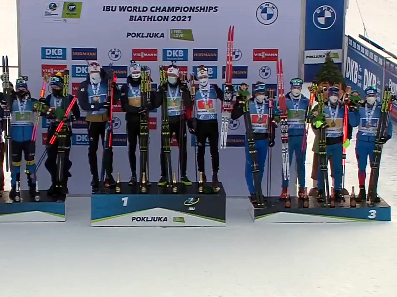 Отечественные спортсмены, из-за санкций выступавшие в статусе команды Союза биатлонистов России без флага и гимна, разделили седьмое-девятое места с командами Белоруссии и Украины.