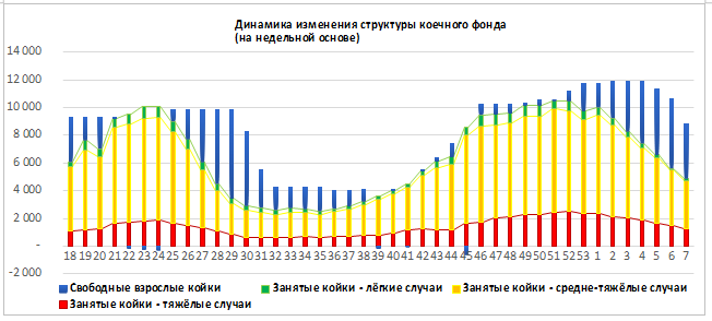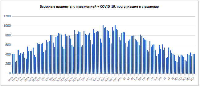 По данным городского координационного совета, с 15 по 22 февраля показатель госпитализаций в Петербурге увеличился впервые после шести недель снижения. В будни, согласно графику, госпитализировали в среднем по 400 человек — за предыдущую неделю этот показатель был в районе 350. При этом число регистраций новых случаев COVID-19 уменьшилось на 10,6 %, а количество активных больных снизилось на 14,6 %. Число выздоравливающих в течение двух недель превышает количество заболевающих.