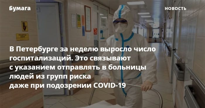 Специалисты связали увеличение госпитализаций с «расширением показаний к стационарному лечению для пациентов старше 70 лет с хроническими заболеваниями, а также для жителей старше 50 лет с сахарным диабетом». Ранее глава комитета по здравоохранению Дмитрий Лисовец говорил, что в Петербурге всех людей из групп риска будут госпитализировать даже при подозрении на коронавирус.