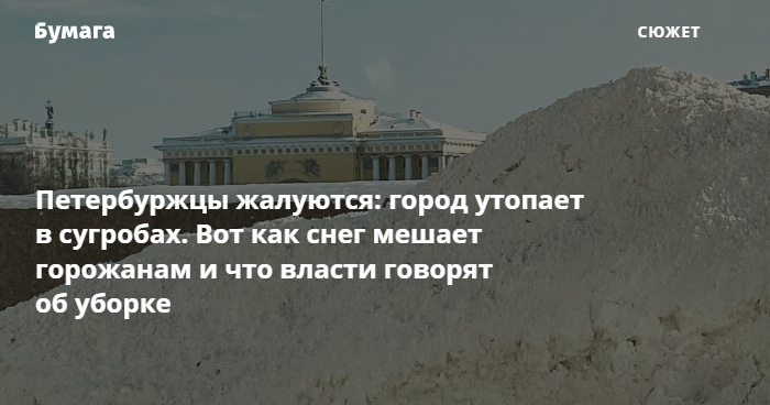 Чиновники отчитываются об активной уборке улиц. Но горожане всё равно жалуются на проблемы: тротуары и дороги завалены снегом, машины не могут выехать из дворов, людям сложно передвигаться, а иногда — даже выйти из дома. «Бумага» рассказывает, как снегопады мешают петербуржцам и что об этом говорят в Смольном.