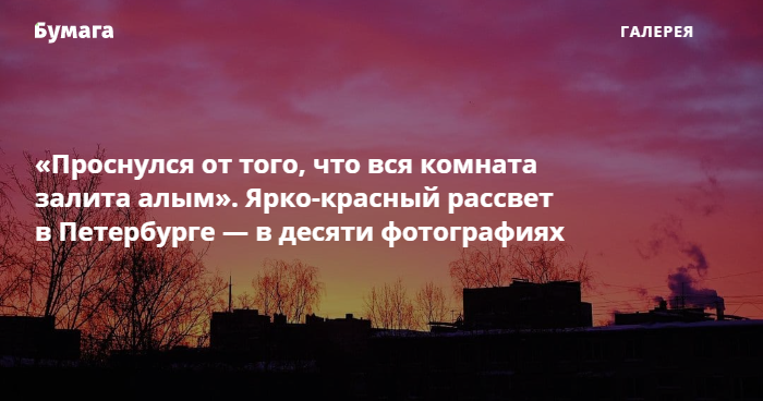 Утром 23 февраля в Петербурге был ярко-красный, алый рассвет. Многие встретили его по пути на работу, некоторых он разбудил. Необычный рассвет заметили также в Ленобласти и на Финском заливе. «Бумага» собрала десять фотографий явления.