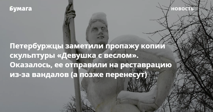 Петербуржцы заметили, что с Безымянного острова у Малой Невки пропала копия скульптуры «Девушка с веслом». Об этом сообщили в закрытой группе жителей Петроградской стороны в фейсбуке «Петроградская диаспора».