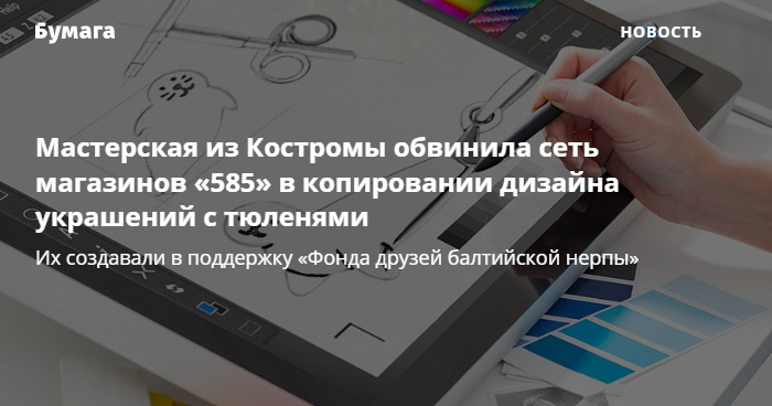 Семейная ювелирная мастерская из Костромы Sniffferson обвинила сеть ювелирных магазинов «585» в копировании дизайна украшений с тюленями. Об этом рассказали в группе Sniffferson во «ВКонтакте».
