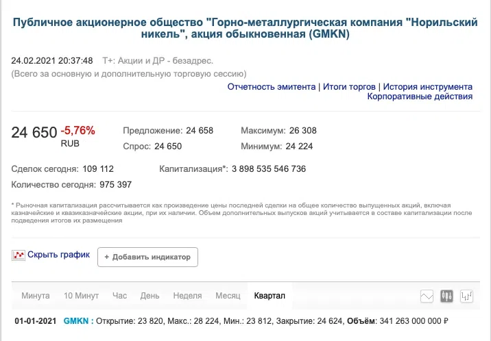 На 20:37 мск акции «Норникеля» на Мосбиржи падали на 5,76%. Цена упала до 24 650 рублей за каждую акцию.