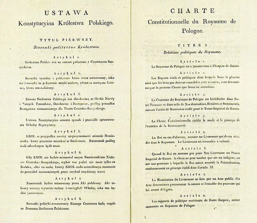 В 1815 году Александр решил провести региональный пилотный проект по внедрению конституции в недавно присоединённом к России Царстве Польском (ex-Великом Герцогстве Варшавском). Конституция эта провозглашала особую роль польского народа в создании государства, особую роль католической религии, свободу печати, свободу личности, особые права польского языка, законосовещательную роль Госсовета, права созыва региональных сеймов, независимость судей. Это была очень демократическая конституция.