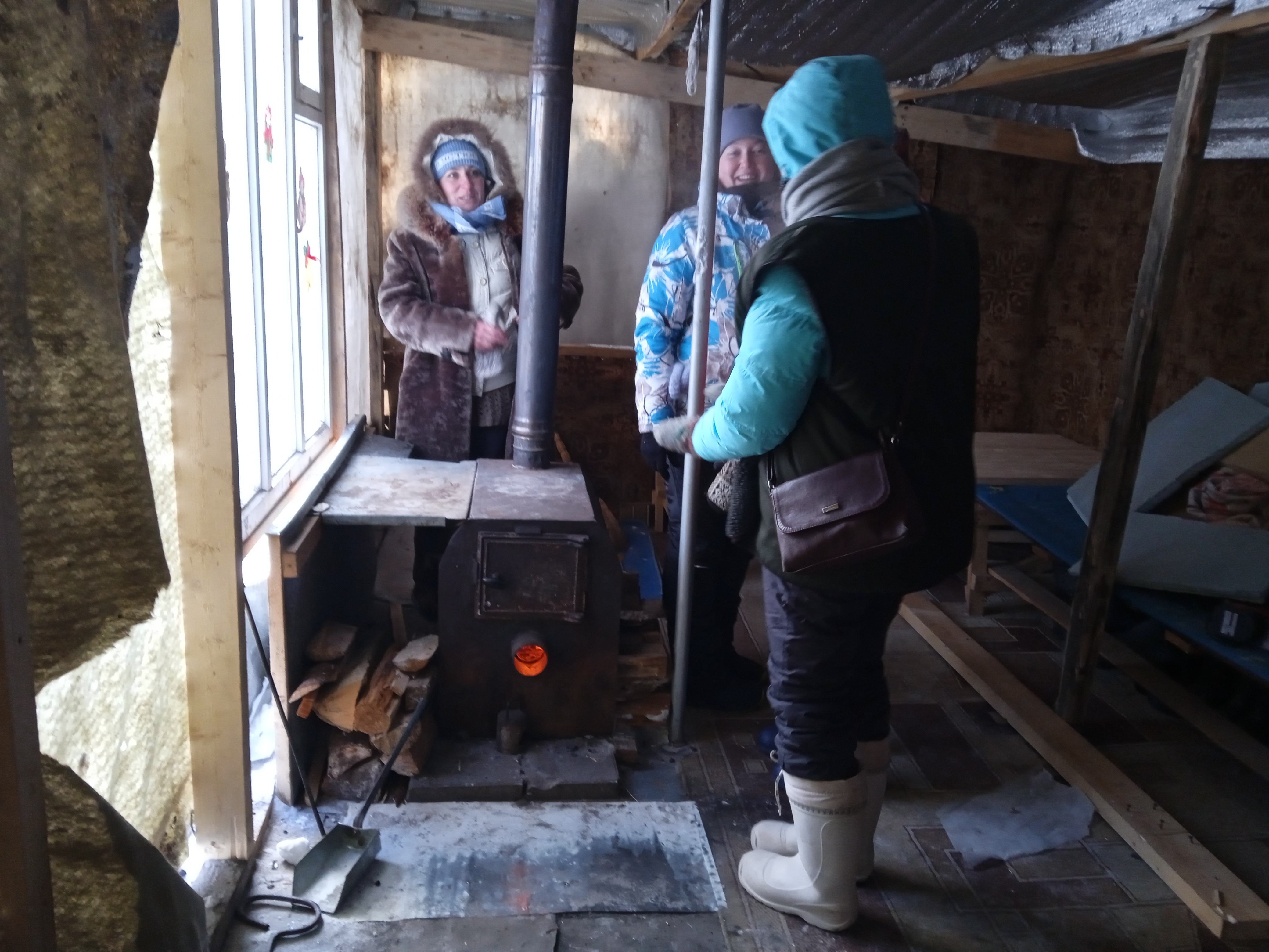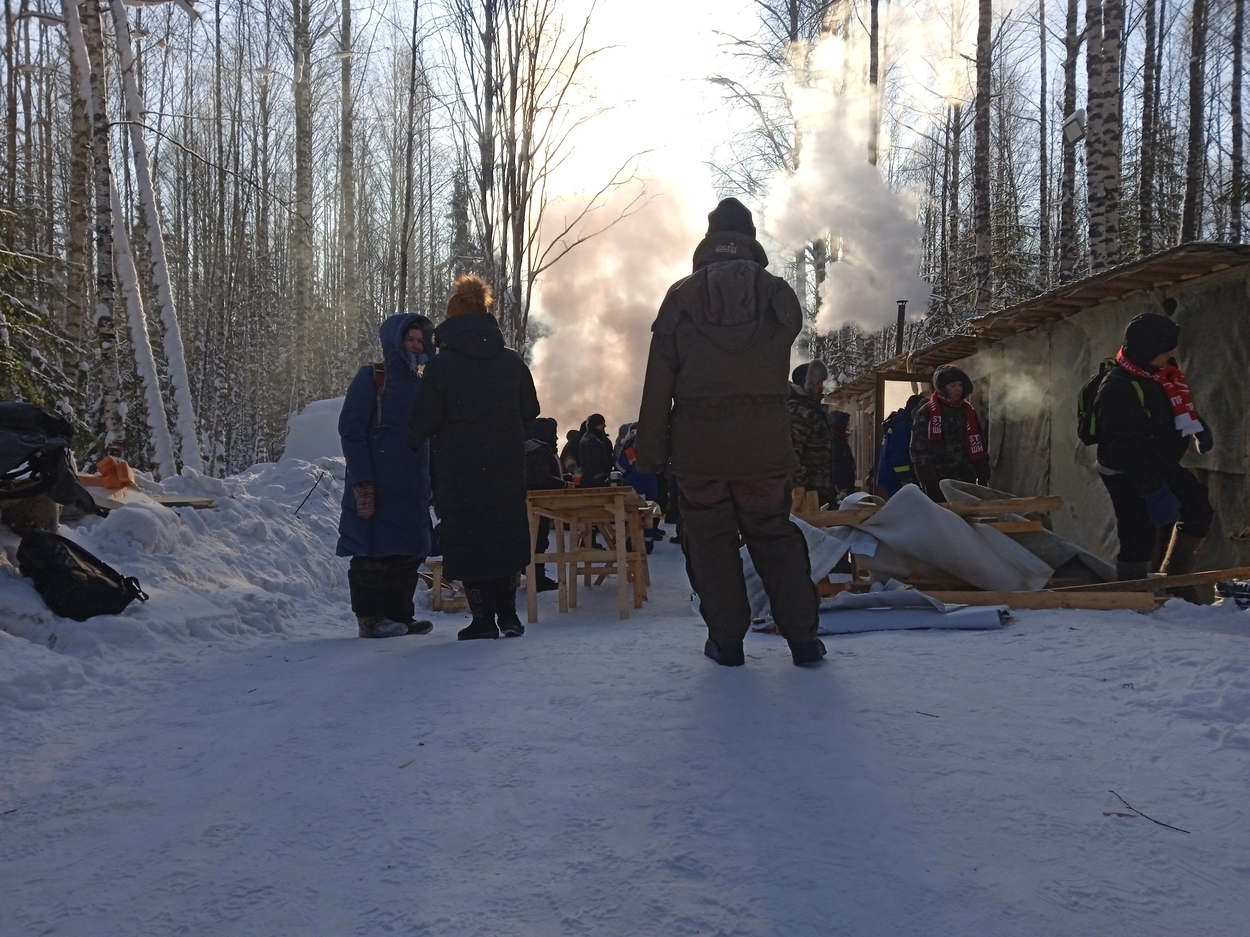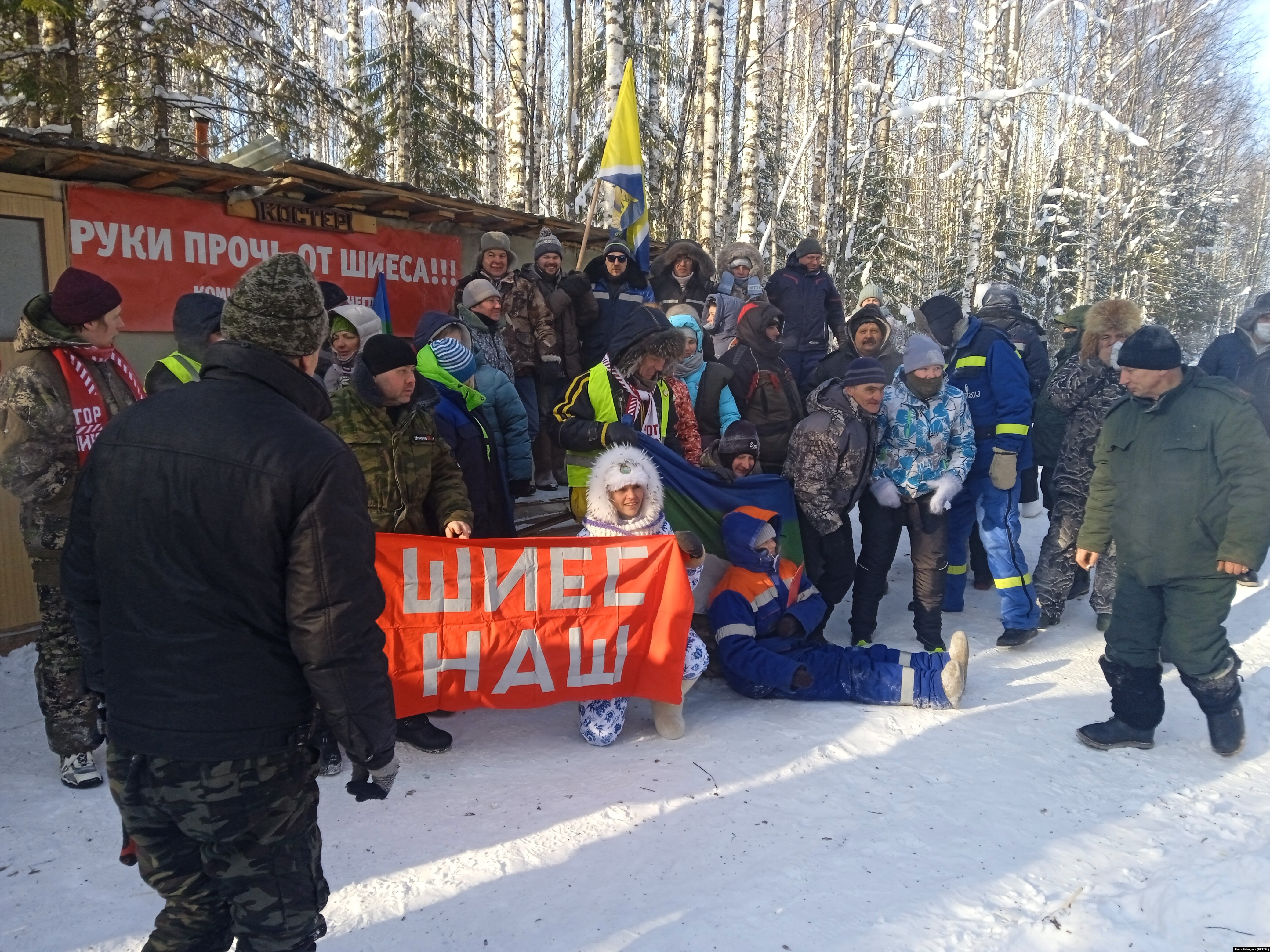 Активисты из Коми и Архангельской области дружно латают поврежденный щитовой домик на посту "Костер", растапливают в нем печь, чистят снег и убирают мусор, приколачивают к стене транспарант со словами "Руки прочь от Шиеса!", он же – памятный знак поста. Перед совместным фото снимающий громко спрашивает: "Шиес чей?" – "Шиес наш!" – кричат ему в ответ. Рядом разожжен костер, женщины из Коряжмы и Яренска готовят шашлыки и греют воду для чая. На расставленных столах – пироги и термосы.