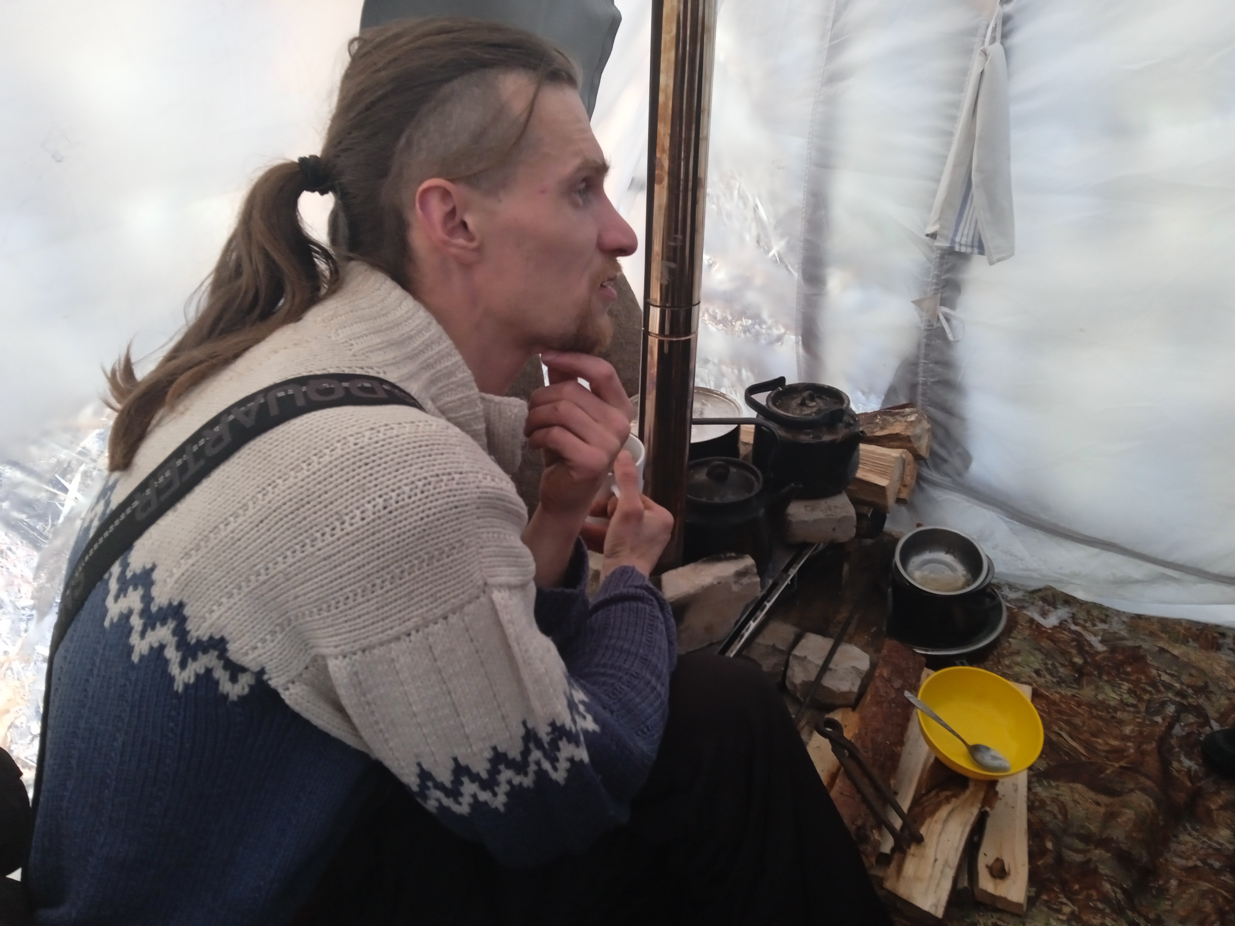 На отдаленном посте "Крепость" сейчас дежурит шесть человек. Николай из Северодвинска и Вадим из Архангельска пьют горячий чай в палатке. Небольшую печку с тонкими стенками приходится постоянно подтапливать, так как из-за сильных морозов она быстро остывает. Генератор пока не работает, поэтому электричества в палатке нет. В темное время светят лишь фонарики.