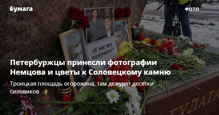 В Петербурге прошла акция памяти Бориса Немцова. Люди принесли к Соловецкому камню фотографии политика и цветы, а также зажгли свечи.
