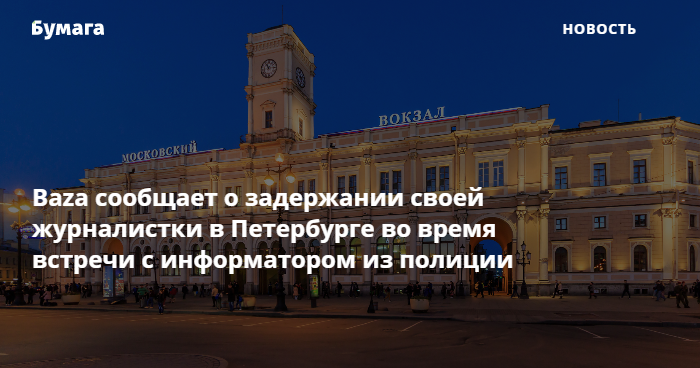 На Московском вокзале в Петербурге задержали журналистку Baza Мяйле Мачюлите, которая должна была встретиться со знакомым сотрудником полиции, пообещавшим передать ей «важную информацию», сообщает издание. Официального подтверждения этого от правоохранительных органов нет.