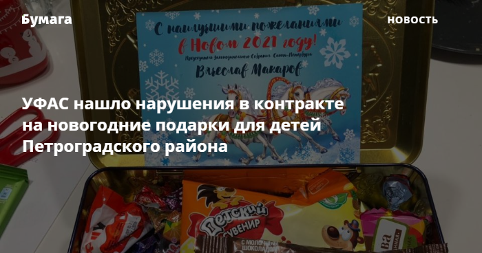Управление федеральной антимонопольной службы по Петербургу нашло нарушения в контракте на новогодние подарки для детей Петроградского района. Документ опубликовал Александр Шуршев, который вместе с другими активистами подал жалобу.