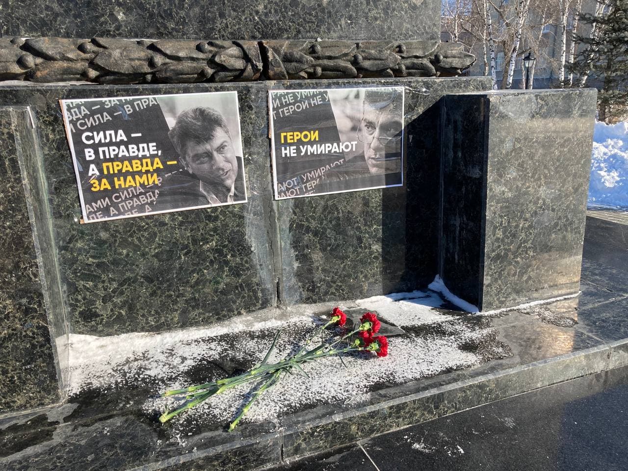 Памятное мероприятие прошло и в Тюмени. Так, по сообщению корреспондента Сибирь.Реалии, местные жители организовали стихийный мемориал. В центре города появились фотографии Немцова, к которым люди возложили цветы. В этом году на снимках с политиком отпечатали лозунг "Сила в правде, а правда за нами!". Был и второй девиз - "Герои не умирают", его скандировали во время прощания с Борисом Немцовым в марте 2015 года. Как сообщили организаторы акции, смысл мероприятия, в первую очередь, почтить память убитого российского политика, и напомнить действующим властям, что "сила в правде".