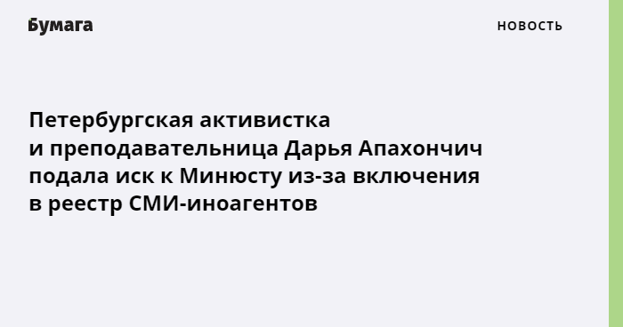 Иск подан в Ленинский районный суд Петербурга. В заявлении Апахончич указывает, что Минюст нарушил нормы российских законов и международного права, включив ее в список СМИ-иноагентов. Петербурженка подчеркивает, что решение Минюста нарушает гарантированный Конституцией принцип равенства, а также право на свободу выражения мнения и на уважение частной жизни.