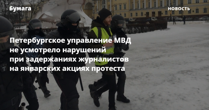 ГУ МВД по Петербургу не усмотрело нарушений в задержаниях журналистов на акциях протеста 23 и 31 января. Это следует из ответа ведомства на запрос союза журналистов Петербурга.