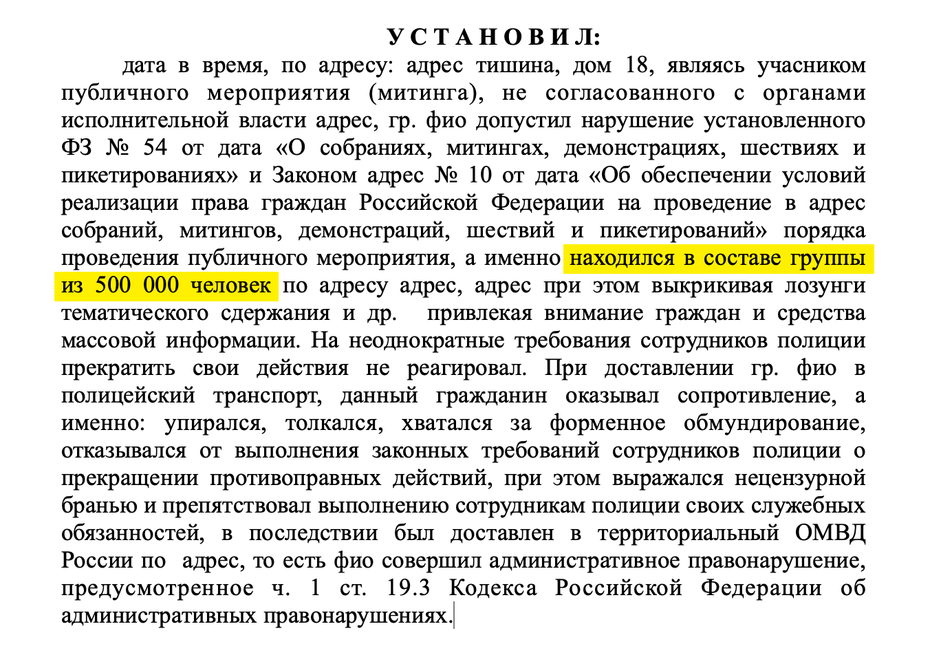 Часто судьи и сами копируют в постановлениях ошибки из протоколов и рапортов, составленных полицейскими. Так, изучая постановления московских судов, «Проект» обнаружил, что в нескольких десятках решений Измайловского суда в отношении разных людей указана очевидная глупость — что задержанный «находился в составе группы из 500 тысяч человек». Хотя в январских акциях принимали участие не более нескольких десятков тысяч человек.