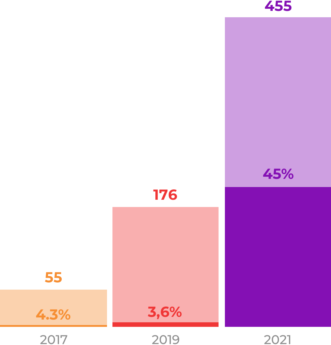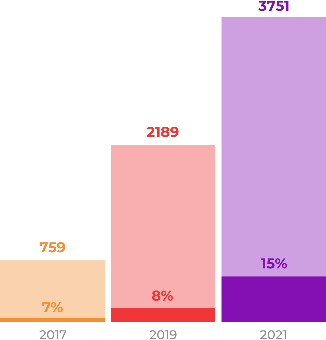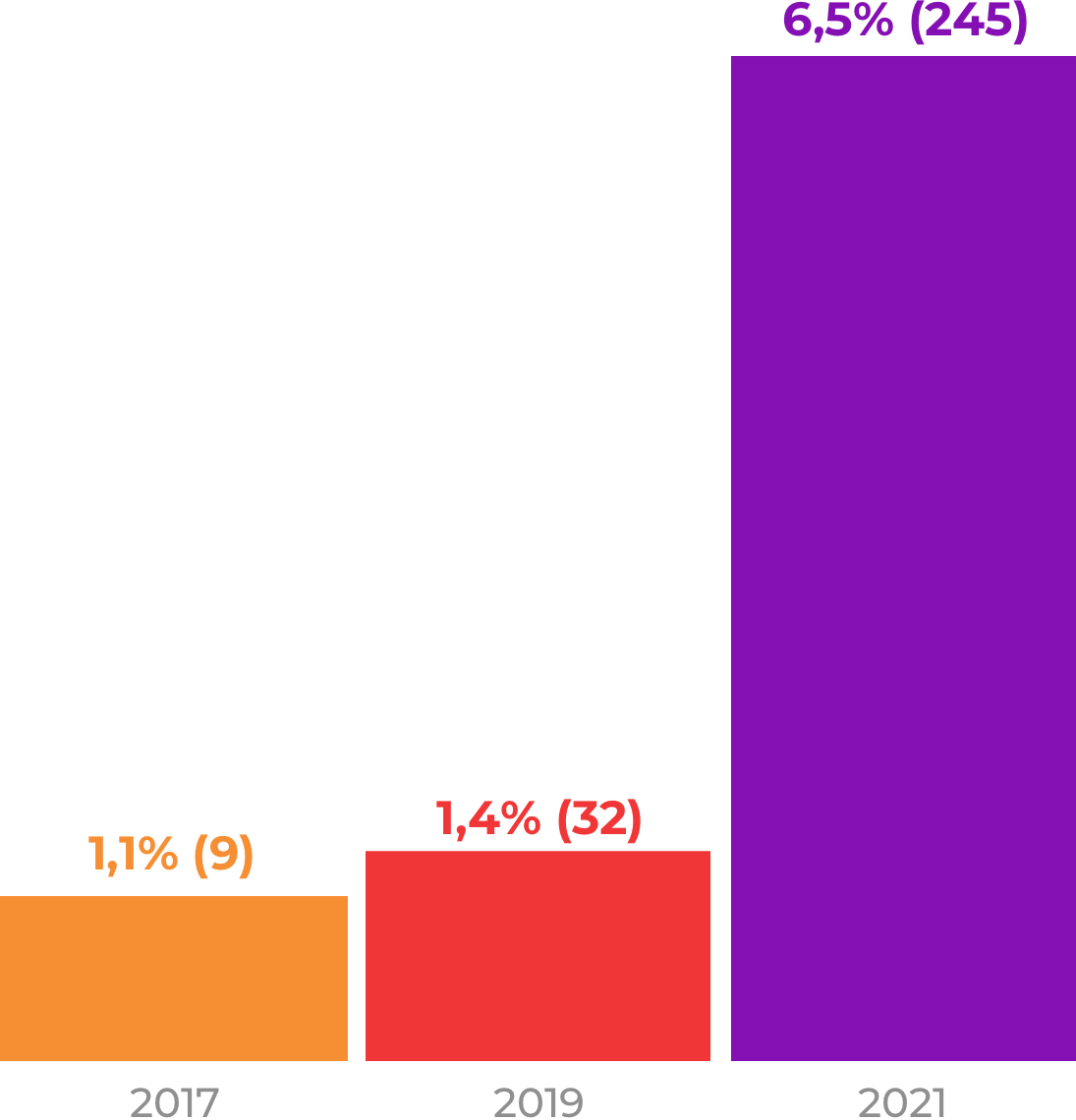 Выводы о поле участников произведены на основании содержания постановлений и фамилий в тех карточках, к которым постановления не прикреплены. В делах 2017 и 2019 года пол распознан у участников 99% дел, в делах 2021 года — у участников 91% дел.
