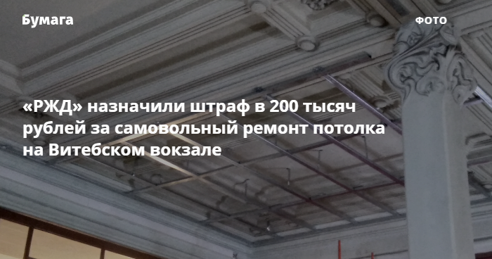 Ленинский районный суд постановил оштрафовать «РЖД» на 200 тысяч рублей за самовольный ремонт вестибюля Витебского вокзала, который является памятником федерального значения. Об этом сообщает КГИОП.