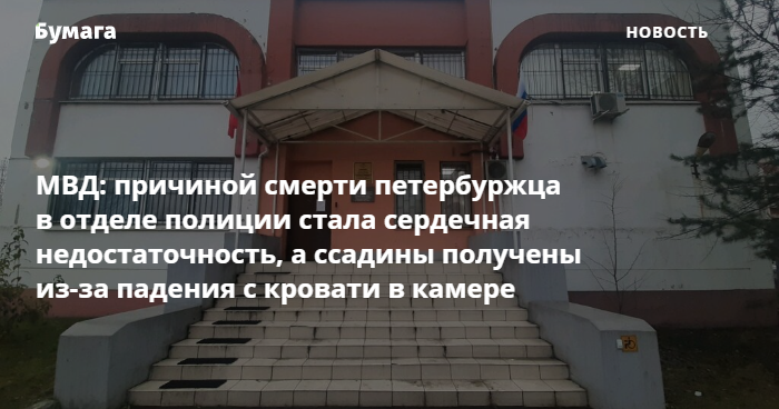 В МВД рассказали, что Следственный комитет РФ по Петербургу назначил судебно-медицинскую экспертизу, которая была проведена. Она показала, что смерть мужчины наступила в результате «острой сердечной недостаточности». «Ссадины, которые обнаружили на данном мужчине, были получены в процессе сердечного приступа, когда мужчина — это подтверждается камерами видеонаблюдения — упал с кровати, на которой находился в камере, и ударился головой об пол», — заявили «Бумаге» в пресс-службе ГУ МВД.