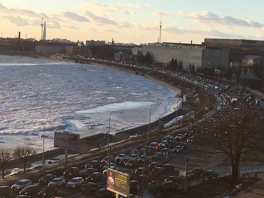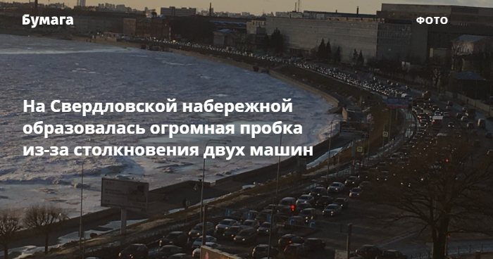 Вечером 2 марта на Свердловской набережной образовалась огромная пробка из-за столкновения двух машин. Очевидцы сфотографировали затор с высоты.