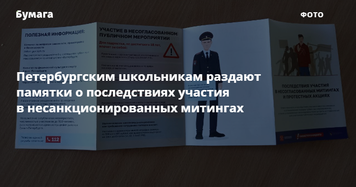 В одной из школ Пушкинского района ученикам раздают листовки, в которых рассказывается об опасности несогласованных протестных акций. Об этом «Бумаге» сообщил читатель.