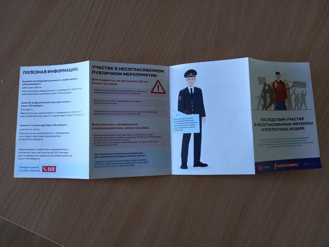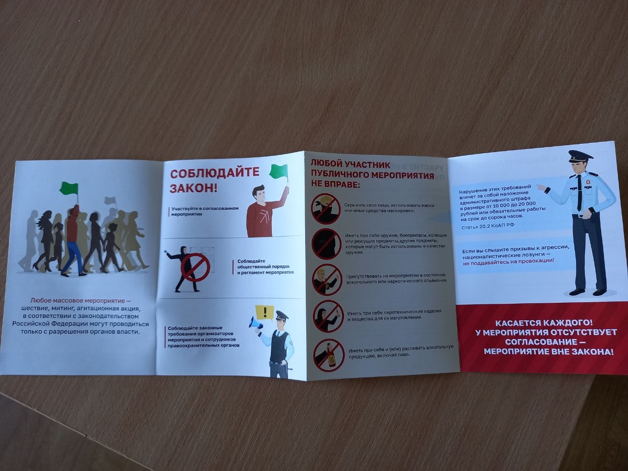 В буклете говорится, что любое массовое мероприятие (шествие, митинг, агитация) «в соответствии с законодательством Российской Федерации может проводиться только с разрешения органов власти». Школьников просят выполнять законные требования силовиков, а также не поддаваться на провокации.