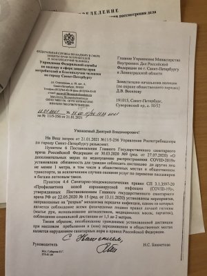 Идрисов на суде по делу Екатерины Новик привел письмо главного санитарного врача Санкт-Петербурга Натальи Башкетовой, написанное 22 января в ответ на запрос заместителя руководителя ГУ МВД Петербурга Дмитрия Веселова, в котором говорится, что массовое пребывание граждан в общественных местах является нарушением установленных в Петербурге санитарных норм.