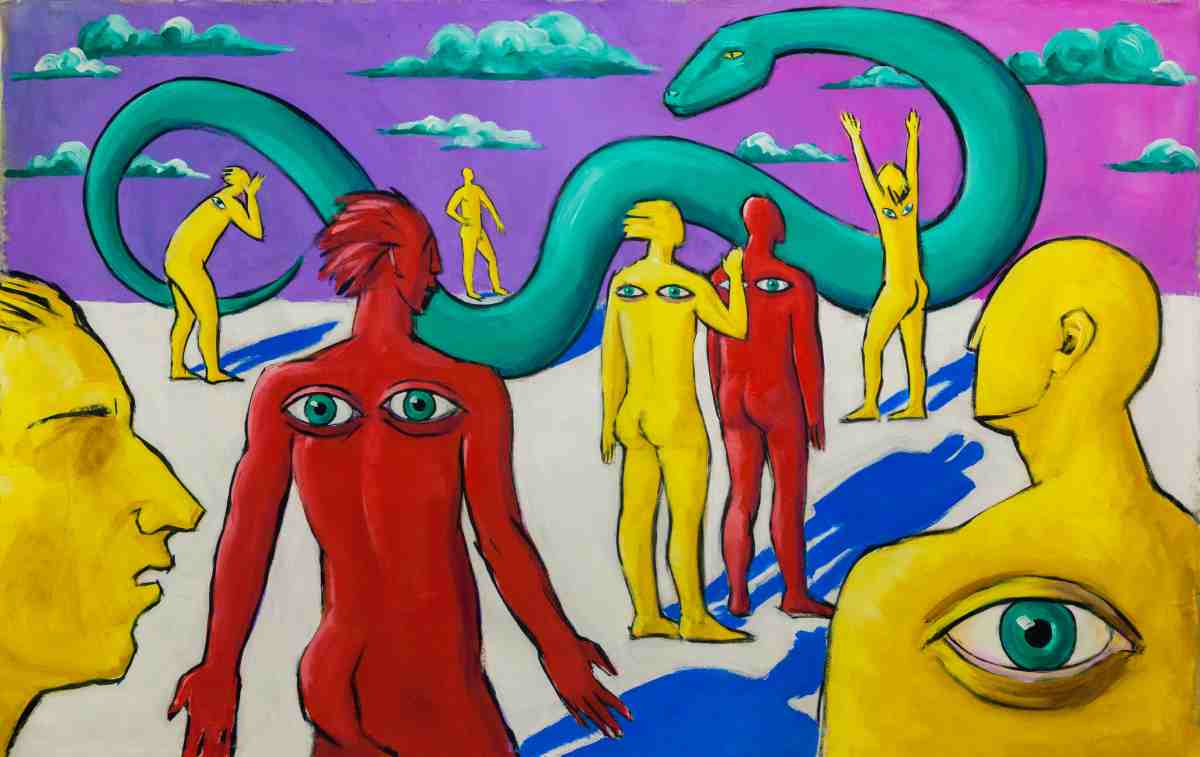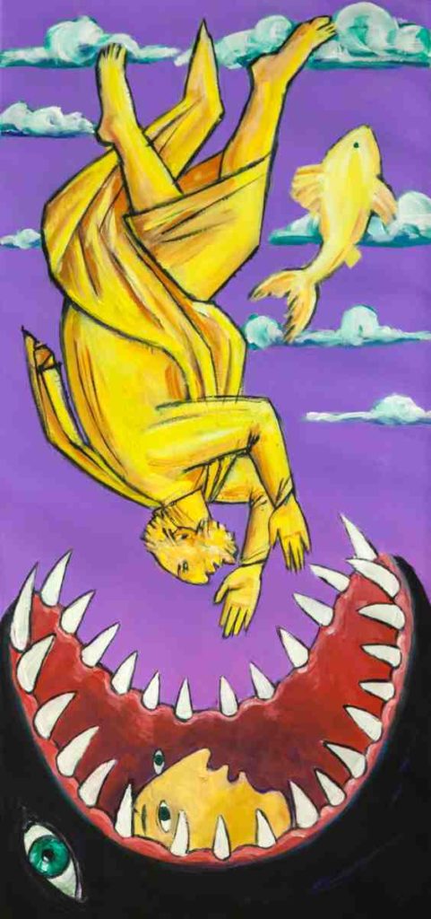 Андрей реставрирует полотно после его транспортировки из колонииФото: Артем Лешко Получилась серия из шести полотен 1,14*1,8 метра. На одном пророк Иона падает с неба в пасть кита, рождая маленькую рыбку. Он падает в ад, но дает надежду на спасение. Полотно о кентаврах о свободе: приснились высота, Крым, горы, небо и я, быстро несущийся вперед. В принципе, это набор визуальных символов, запомнившихся после снов.