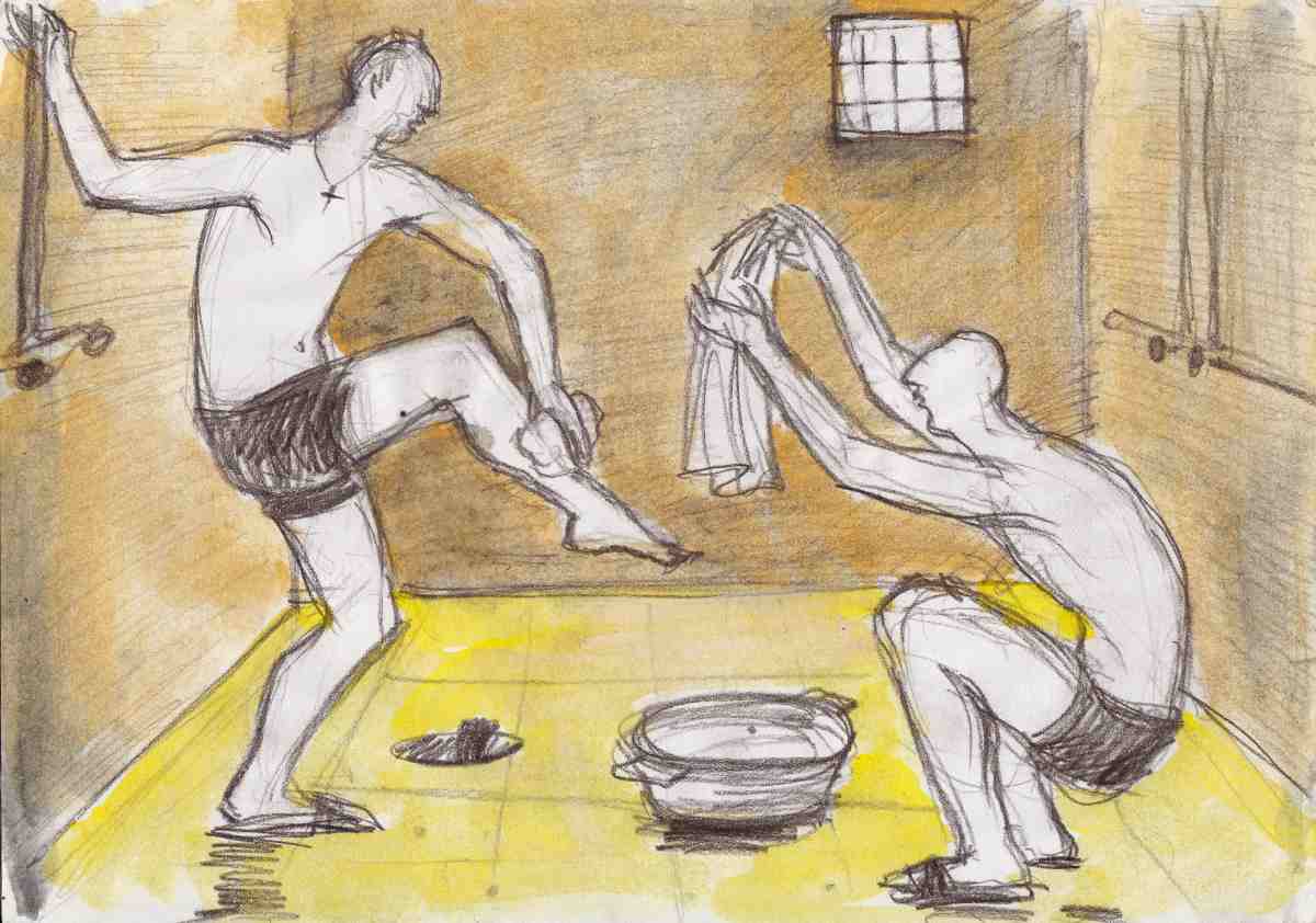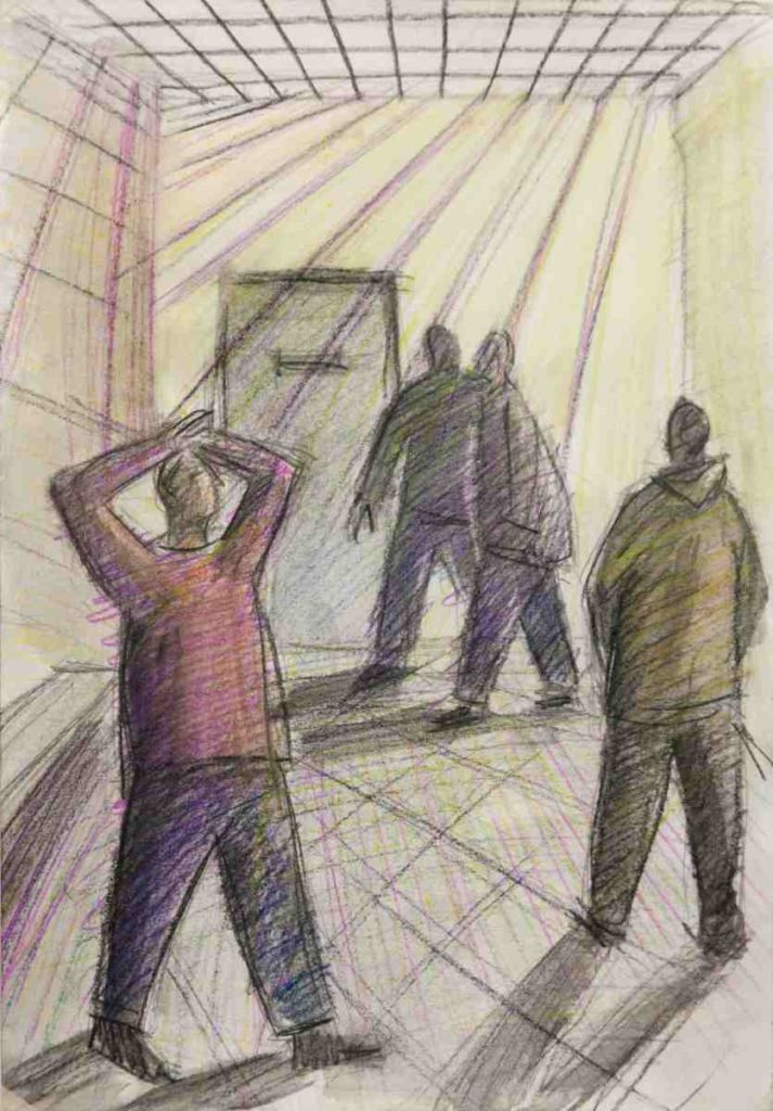 Я оказался в СИЗО. Несмотря на шок и ужас, первые наброски я начал делать еще на карантине: как художник я испытывал потребность в искусстве и выражении. А одна сотрудница подарила мне ручку и тетрадь. Я просто начал рисовать все, что видел и проживал. Заниматься отвлеченными вещами в новой всепоглощающей реальности было невозможно. Получилось что-то похожее на небольшой комикс про ритуал лишения свободы.