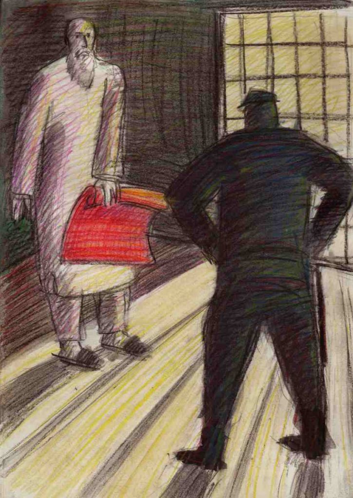 К счастью, я оставил с собой тетради с записями. По правилам все запрещено: краски, кисти, карандаши, маркеры. На первом обыске, еще перед отправкой в автозак, меня спросили: «Есть запрещенное?» Я честно ответил. Но все пропустили. В поезде, а обыски происходят на каждом этапе, вообще комично получилось. Нашли краски и кисти: «Ты художник? Нам нужна стенгазета в вагон. Нарисуй, пожалуйста, как наш поезд идет из Москвы через Тамбов в Астрахань». Поезд ехал, а я рисовал едущий поезд. Конвоиры были счастливы: принесли нам таз гречневой каши с тушенкой.
