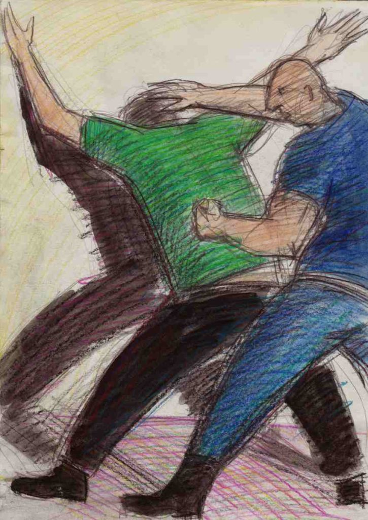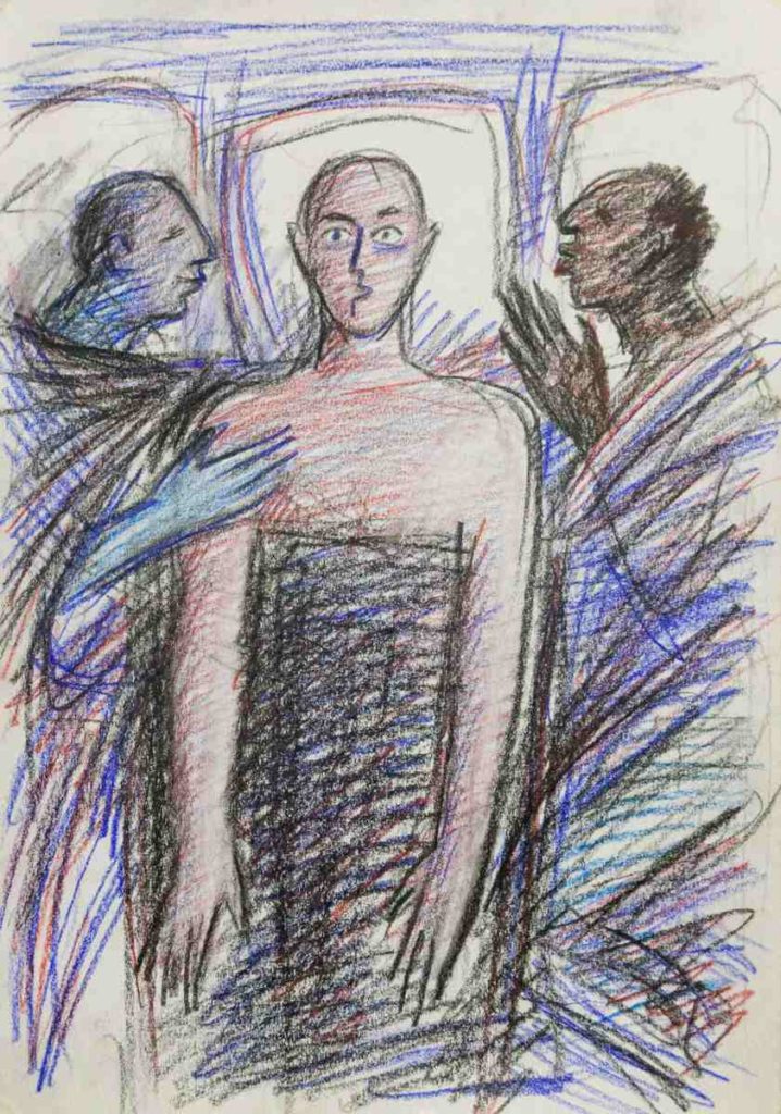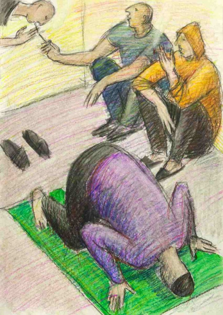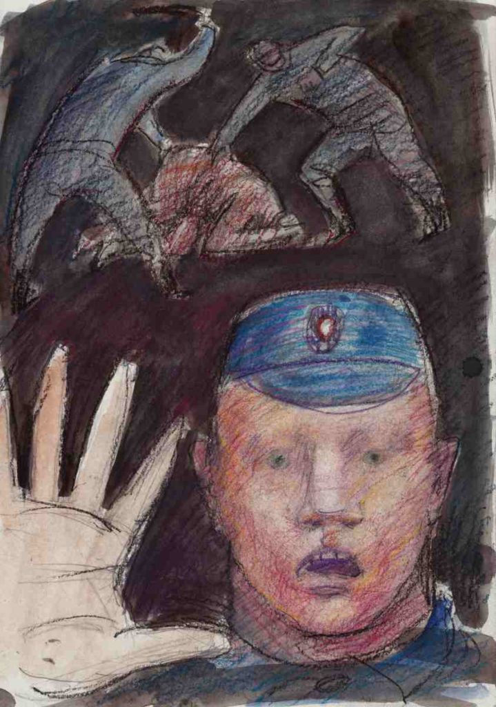 Через полгода мне дали должность ночного кладовщика. Построения, быт проходили мимо, я выдохнул. Склад был практически моим личным пространством. Нужно было просто выдавать довольствие: вещи, матрас, белье, посуду. Это занимало час-полтора в день. Всю ночь я был предоставлен сам себе: читал книги, которые не пропустили через приемник, слушал рок-радио. Получил передачу с акварелью и масляной пастелью и стал активно продолжать серию про самое начало: электричку, первые допросы, автозак, душ, карантин. Но на складе я пробыл недолго: слишком активно общался с арестантами. Помня свои опыт и эмоции первых дней, я старался их как-то поддерживать, успокаивать, предлагал чай и угощал своим запасом галет.