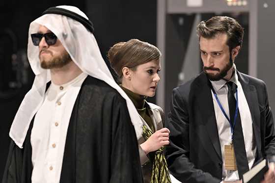 © Владимир Постнов Сцена засыпана мелкой галькой. Сад вековых камней делит вдоль плексиглас стены. По ту сторону от зрителя — рамка металлоискателя, по эту — длинный стол переговоров. Выверенными движениями молодые люди в строгих костюмах расставляют на столе бутылки с водой, выравнивают расположение кресел до миллиметра. За стеклом тянется долгая процессия. Мобильные телефоны, ключи, ремни — на стол. Писк металлической рамки. Следующий. Подробность превращается в процессуальность. Мы в прямом эфире. Здесь и сейчас.