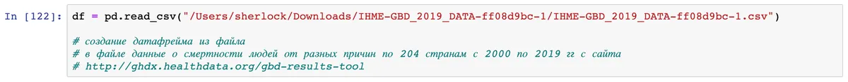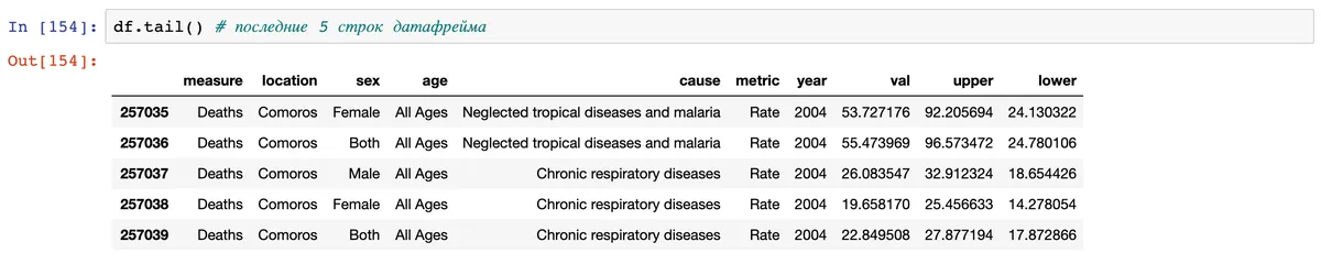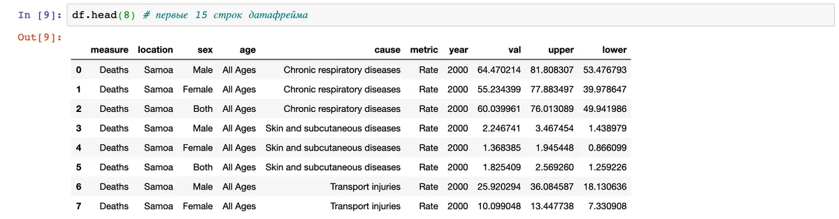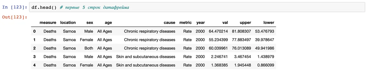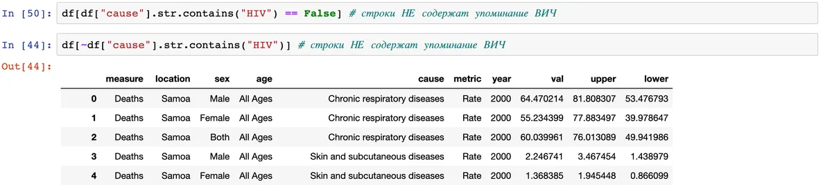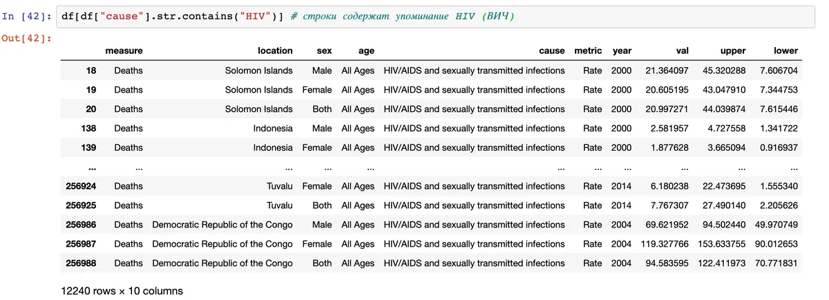 Если мы не знаем точно, как называется причина смерти, либо название слишком длинное, удобно использовать метод contains (содержит). Метод str.contains("HIV") выдаст нам строки, в которых упоминается HIV (ВИЧ).