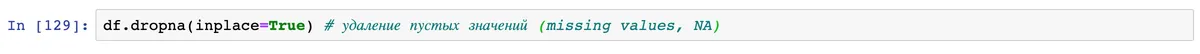 У нас в датафрейме нет пустых значений (missing values, NA), но часто они бывают в реальных данных, «загрязняют» их и мешают с ними работать. От пустых значений можно избавиться методом dropna.